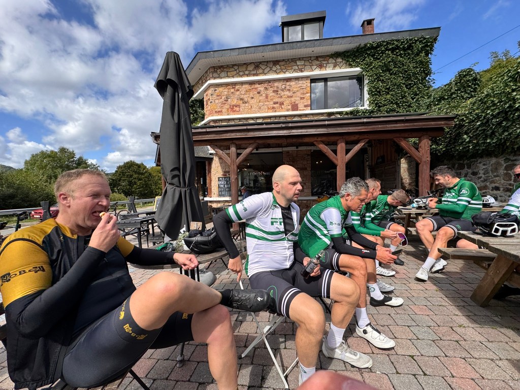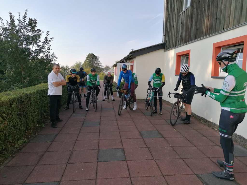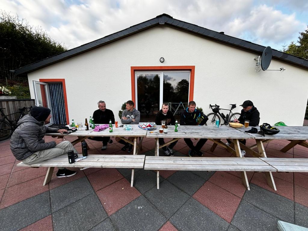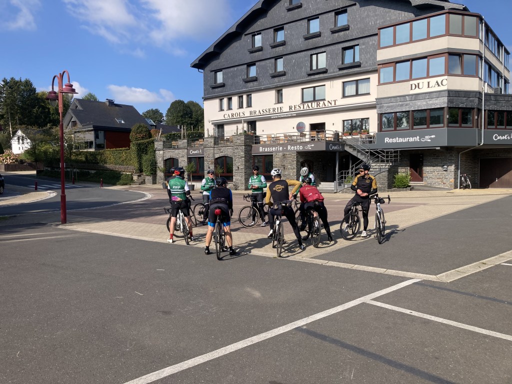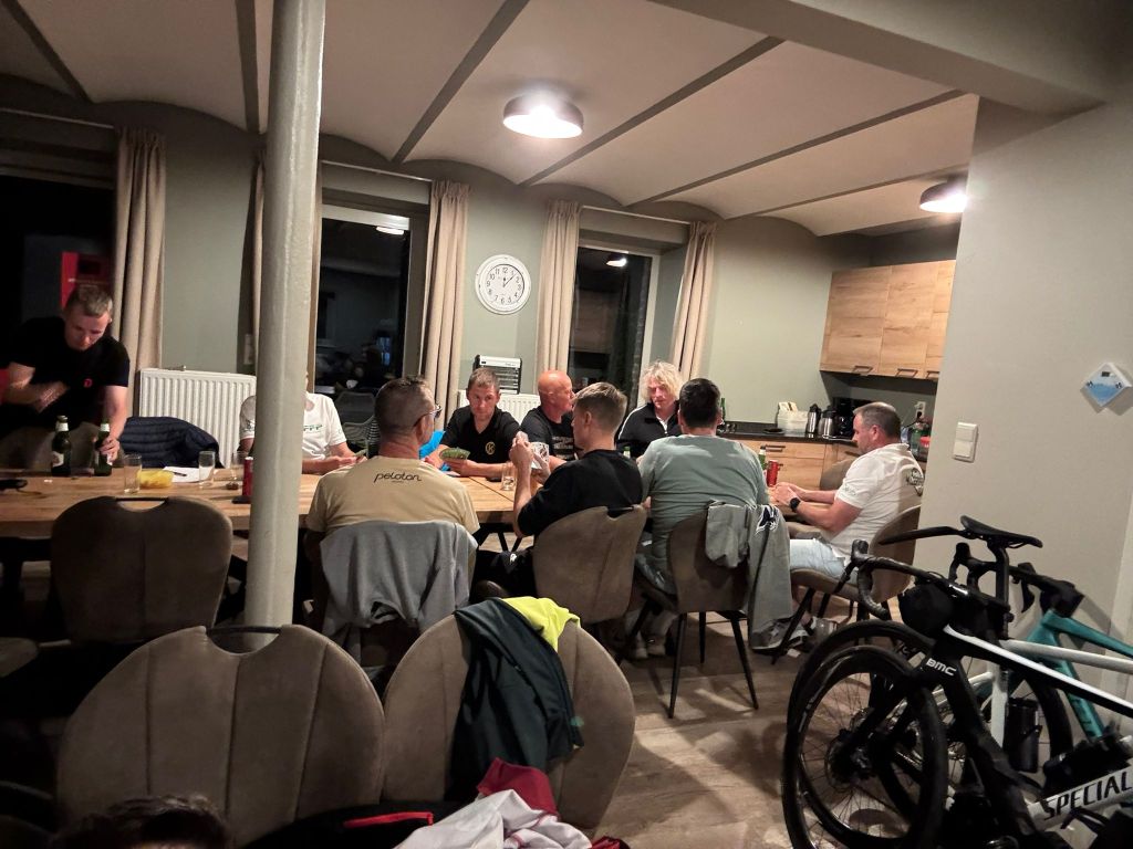 Na een autorit van een 2-tal uurtjes en een kleine versnapering kwamen we aan bij onze uitvalsbasis op een hoogte van 550m. Wat ook meteen impliceerde dat we elke dag met een fikse beklimming eindigden. De koffers werden vlug uitgeladen, de fietsen in gereedheid gebracht en vestimentaire keuzes werden overwogen. Met wat geluk zouden we het droog houden en de temperatuur zat wel goed zo net na het middaguur. De eerste rit zou grotendeels de Ourdalroute volgen, was 102 km lang en bevatte 1650 hoogtemeters. Waren we klaar? En of! Weken en maanden van voorbereidingen, trainingskampen, hoogtestages, voedingsplannen, mentale en fysieke coaches, mentale oorlogsspelletjes via WhatsApp, geen alcohol (of minder) de laatste weken, investeringen in nieuw materiaal… Alles om in orde te zijn voor dit weekend. Nog een groepsfoto en… Jetzt geht’s los! Voor wie zijn gsm nog moest wegsteken of zijn gps nog niet had ingedrukt was het te laat. Als een bende losgeslagen renpaarden doken we de vallei van de Our in. De kop van de koers zagen we niet meer terug. Natuurlijke selectie. Voetjes op de grond. Al snel werden er enkele groepjes gevormd en Jan hield vanuit de achterste gelederen in de gaten of er niemand werd achtergelaten. Bedankt voorzitter! Na een 65-tal kilometer passeerden we in Sankt Vith de gekende Bäckerei Fonk waar een plotse suikerdip werd verholpen met een rijstaart en een cola. Voor sommigen was dat nog niet genoeg en volgden er nog een smos en als toetje een koffiekoek. Vooraan legden de Wouten er de pees op, achteraan beslisten B.D en K.N om all-in te gaan voor de laatste 35 kilometer met algemene verbrokkeling tot gevolg. Er werd zelfs een roofvogel gespot die klaar zat om lijken te pikken. Waar bij sommigen de benen leegliepen en de regenbui niet vermeden kon worden, stonden de eersten al onder de douche en konden zij al genieten van een heerlijke Pasta à la Marco. Onze voorzitter zag dat iedereen het wel ging halen en rolde eigenhandig nog een deel Kleppers op. Tegen 17u waren ook de laatsten binnen en konden zij ook de beentjes onder tafel schuiven. Een geslaagde eerste dag werd afgesloten met, hoe kan het ook anders, enkele Kleppers (nu wel het bier). En omdat zaterdag een zware dag ging worden werd het niet te laat en lag iedereen op tijd onder de wol.