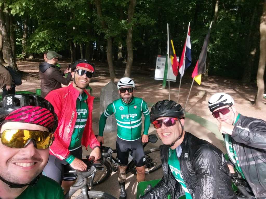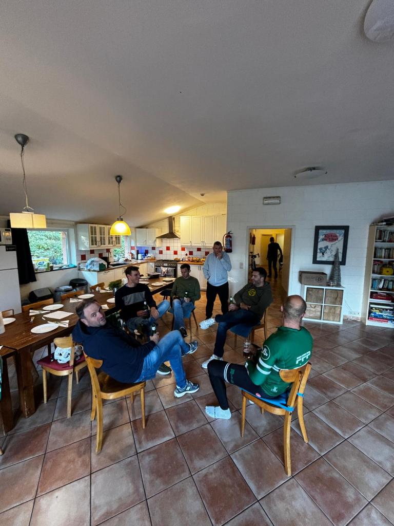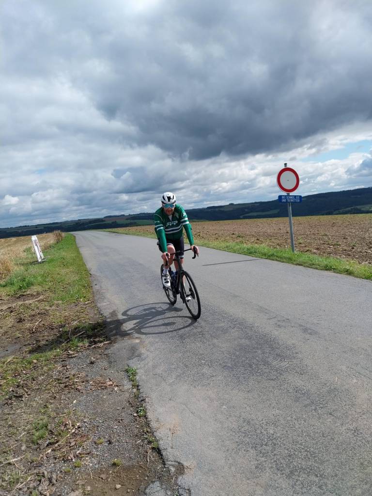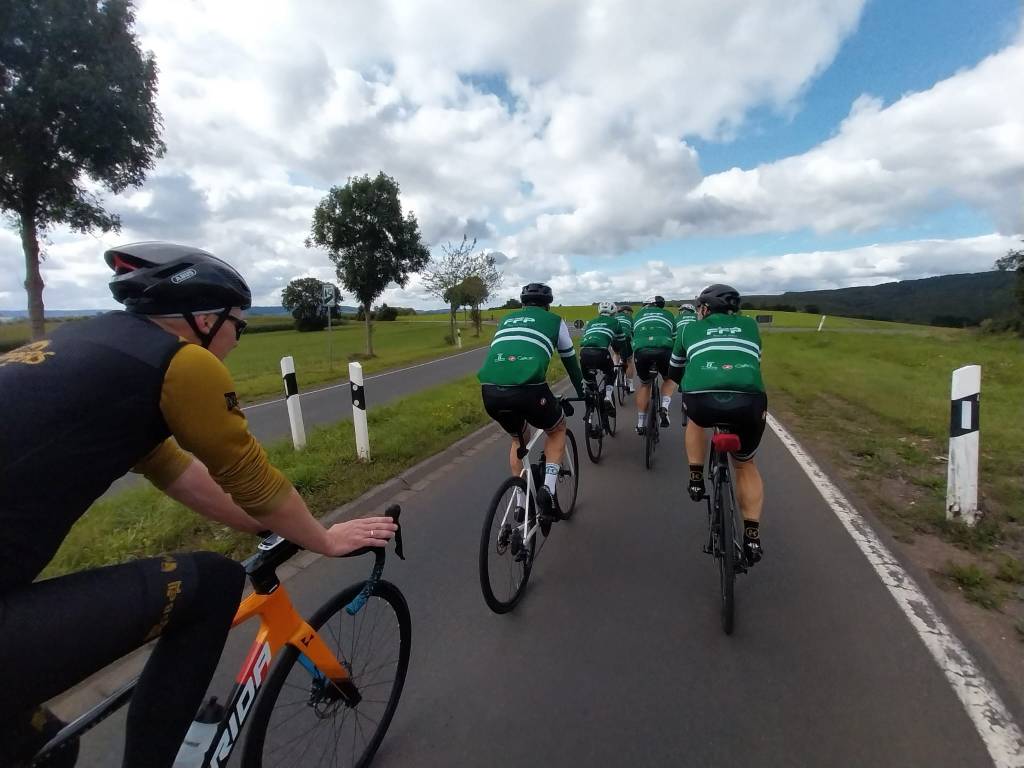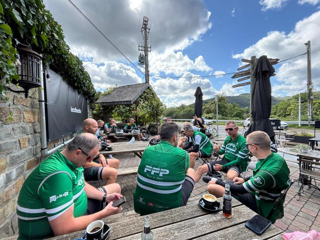 Na een autorit van een 2-tal uurtjes en een kleine versnapering kwamen we aan bij onze uitvalsbasis op een hoogte van 550m. Wat ook meteen impliceerde dat we elke dag met een fikse beklimming eindigden. De koffers werden vlug uitgeladen, de fietsen in gereedheid gebracht en vestimentaire keuzes werden overwogen. Met wat geluk zouden we het droog houden en de temperatuur zat wel goed zo net na het middaguur. De eerste rit zou grotendeels de Ourdalroute volgen, was 102 km lang en bevatte 1650 hoogtemeters. Waren we klaar? En of! Weken en maanden van voorbereidingen, trainingskampen, hoogtestages, voedingsplannen, mentale en fysieke coaches, mentale oorlogsspelletjes via WhatsApp, geen alcohol (of minder) de laatste weken, investeringen in nieuw materiaal… Alles om in orde te zijn voor dit weekend. Nog een groepsfoto en… Jetzt geht’s los! Voor wie zijn gsm nog moest wegsteken of zijn gps nog niet had ingedrukt was het te laat. Als een bende losgeslagen renpaarden doken we de vallei van de Our in. De kop van de koers zagen we niet meer terug. Natuurlijke selectie. Voetjes op de grond. Al snel werden er enkele groepjes gevormd en Jan hield vanuit de achterste gelederen in de gaten of er niemand werd achtergelaten. Bedankt voorzitter! Na een 65-tal kilometer passeerden we in Sankt Vith de gekende Bäckerei Fonk waar een plotse suikerdip werd verholpen met een rijstaart en een cola. Voor sommigen was dat nog niet genoeg en volgden er nog een smos en als toetje een koffiekoek. Vooraan legden de Wouten er de pees op, achteraan beslisten B.D en K.N om all-in te gaan voor de laatste 35 kilometer met algemene verbrokkeling tot gevolg. Er werd zelfs een roofvogel gespot die klaar zat om lijken te pikken. Waar bij sommigen de benen leegliepen en de regenbui niet vermeden kon worden, stonden de eersten al onder de douche en konden zij al genieten van een heerlijke Pasta à la Marco. Onze voorzitter zag dat iedereen het wel ging halen en rolde eigenhandig nog een deel Kleppers op. Tegen 17u waren ook de laatsten binnen en konden zij ook de beentjes onder tafel schuiven. Een geslaagde eerste dag werd afgesloten met, hoe kan het ook anders, enkele Kleppers (nu wel het bier). En omdat zaterdag een zware dag ging worden werd het niet te laat en lag iedereen op tijd onder de wol.