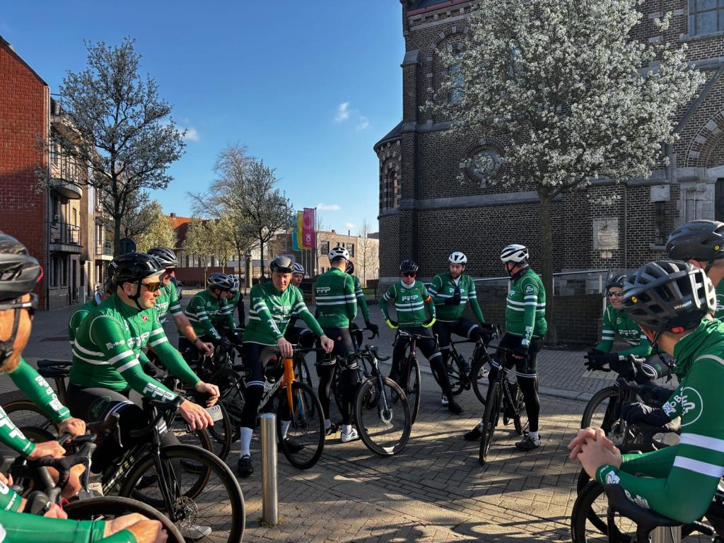 Om 9u verzamelden dan ook een twintigtal Kleppers in vol ornaat aan Het8stesacrament: groen-witte Flanders Food Productions outfit, opgeblonken kaders, gesmeerde kettingen en vooral veel lachende, gemotiveerde gezichten.