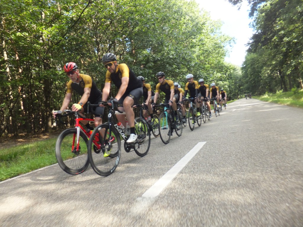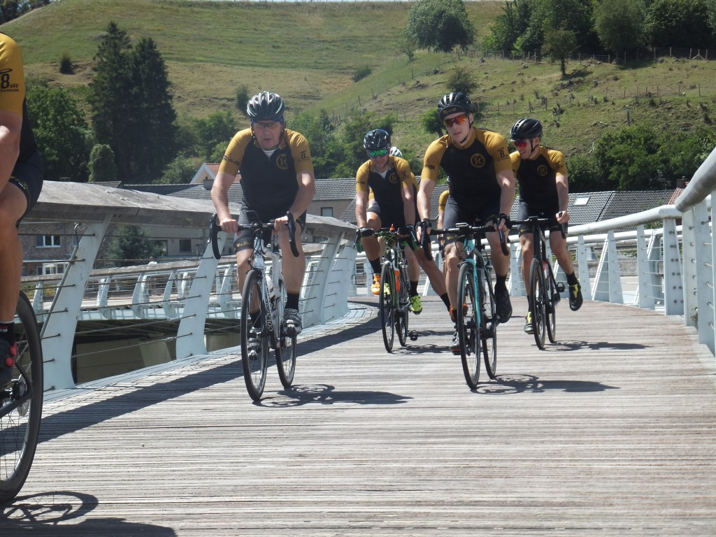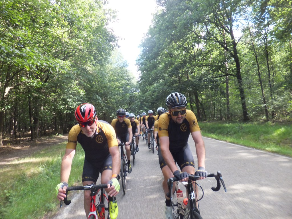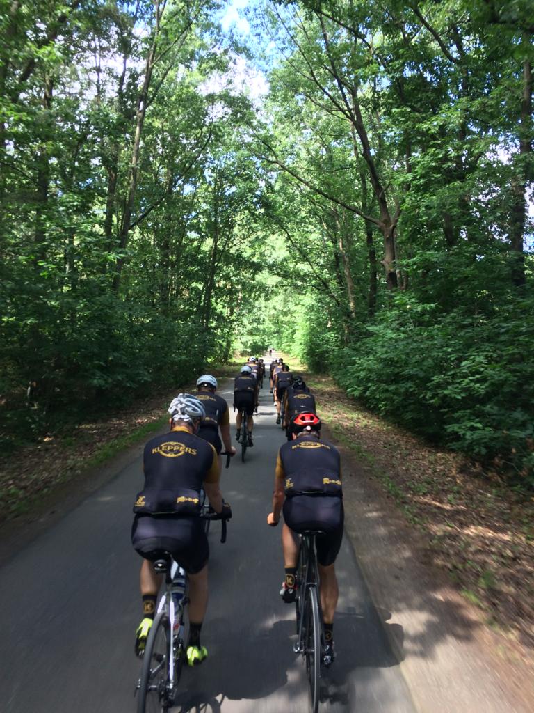 21 Juli, deze datum stond bij vele Kleppers vetgedrukt in de agenda. Door het wegvallen van verschillende toertochten was dit het moment om de benen een keer testen. Zoals steeds, verzamelen aan het Achtste Sacrament. Klokslag 08.30u, na opzwepende en respectvolle woorden (lees: zand strooien) van de voorzitter trekt het peloton van 16 Kleppers zich op gang. Zoals het een echte koninginnenrit betaamt, rijden we zuidwaarts, richting glooiend terrein. De sfeer, het weer en de wind zijn ons in het eerste gedeelte gunstig gezind. Het gaat in een mooi gestaag tempo richting Zutendaal om daarna het glooiende Riemst binnen te rijden. Hier en daar worden voorzichtig de eerste versnellingen geplaatst. De lockdown heeft voor een ongezien vormpeil gezorgd bij alle Kleppers waardoor deze eenvoudig worden verteerd. Na Riemst, het echte werk, het tweeluik Hallembaye – Oude Hallembaye, wat zoveel betekent als alle registers open. Dus…Trein op de rails en gaan. Hier en daar wordt er onderling een duel uitgevochten en sommige duelleren met zichzelf. Al bij al, geen noemenswaardige schade, dus maar door richting Oupeye waar een lekkere pasta op ons wacht. Na de pauze en de nodige flauwe zever zetten we ditmaal koers richting Noorden, met de wind tussen de wenkbrauwen en nog enkele klimmetjes in het verschiet. Net voor de laatste kuitenbijter, een zeldzame lekke band, dit keer voor onze wegkapitein van de dag, JC (in het milieu ook wel gekend onder de naam ‘Il Capo’). Na de vlotte bandenwissel moeten we onmiddellijk aan de bak, want de Muizenberg torent plots voor ons op. Met percentages tot 10 %, de ideale speeltuin voor Neo-Klepper K. Kums aka K. Koms. Boven aangekomen op deze puist beginnen de eerste tekenen van vermoeidheid op te spelen. Maar, geen nood, de sfeer zit nog steeds optimaal en als een volleerd peloton banen we ons een weg richting Pelt waar er ons nog een hapje en drankje te wachten staat. Rustig keuvelend en lachend rijden we Pelt binnen, niet wetende wat ons te wachten staat. De laatste demarrage op de Breugelweg, ditmaal uit onverwachte hoek. Zonder namen te noemen trekt dit Vlaams Brabants trekpaard alles op een lint en etaleert zijn uitstekende conditie (het geheime recept, kunstgras). Daarna rijden we rustig het centrum binnen om onze dorst te laven, honger te stillen en na te kaarten op het terras van het Achtste. Samengevat, wat een topdag! Dank aan allen die er bij waren en dit mogelijk hebben gemaakt.
