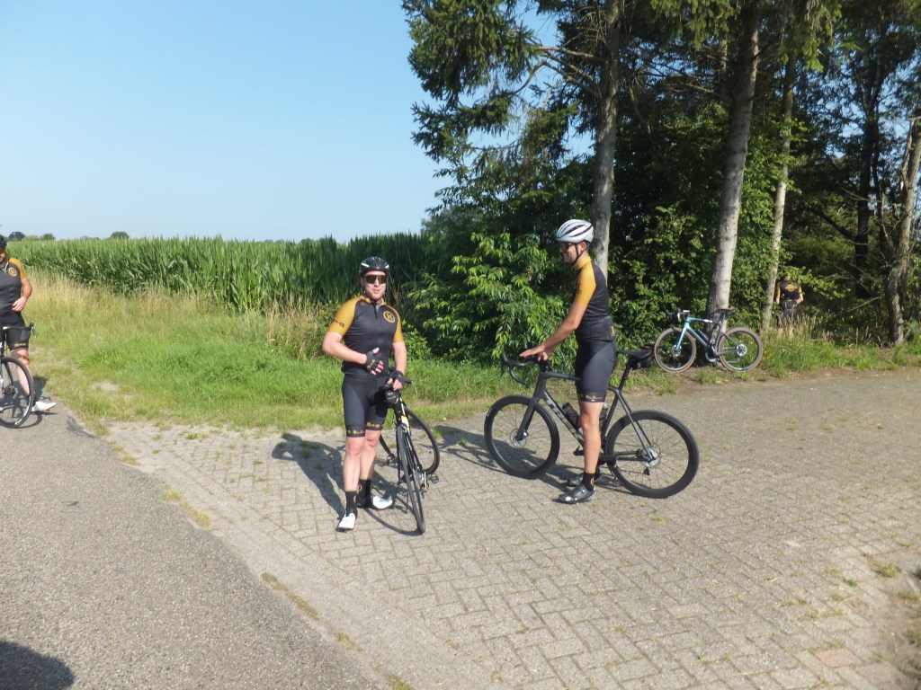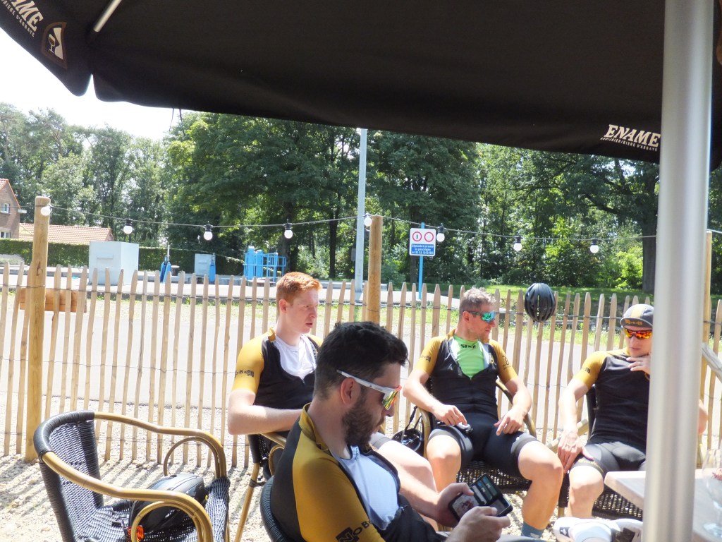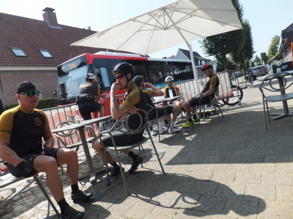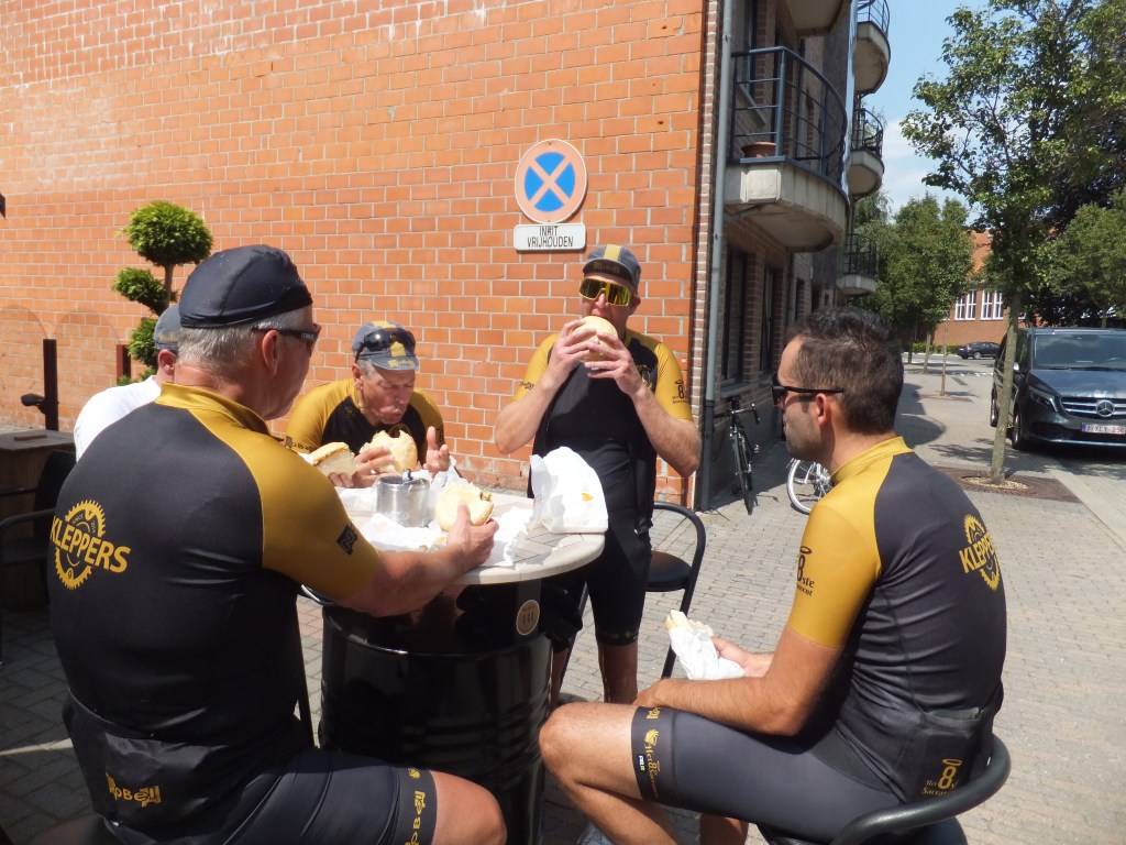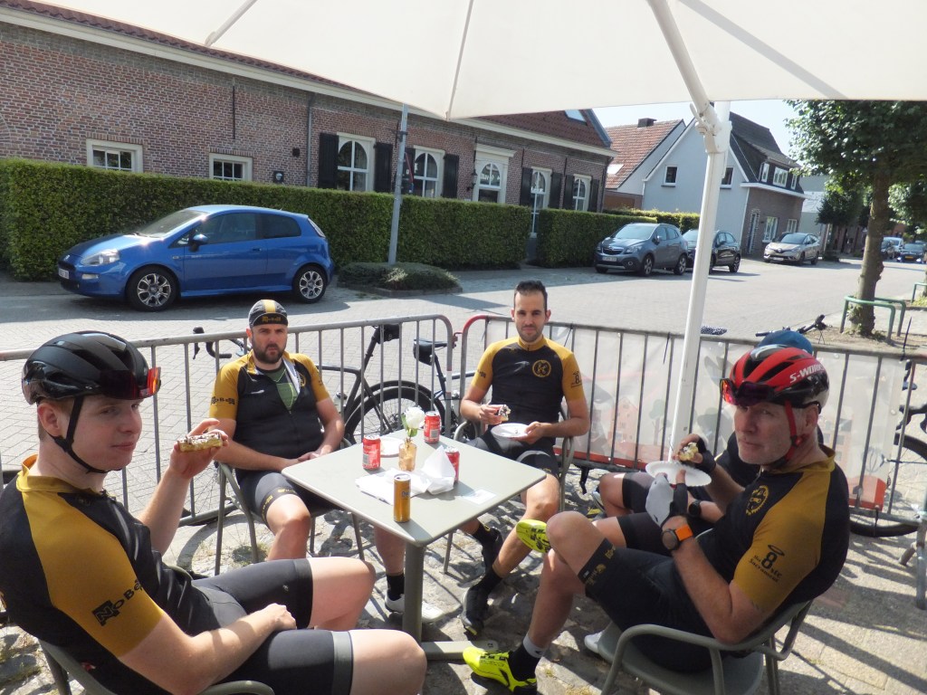 Om 8u werd de rit door de voorzitter opgang getrokken. Met een opbouwend tempo gingen we richting de nederlandse grens. De weersomstandigheden waren subliem. Men kon geen beter weer wensen voor deze mooie dag. Na 60km werd de eerste plaspauze ingelast, waarbij we ook direct hulp hebben aangeboden aan 2 fietsers met pech. Direct ging het tempo terug de hoogte in, want we reden richting de bakker in Meensel-Dreef om onze eerste honger te stillen. Iedereen kon genieten van een stuk taart. Voor elk wat wils! Enkel voor Beton Baron was de honger nog niet gestilt… Hij heeft dit opgelost door een extra worstenbroodje binnen te spelen.