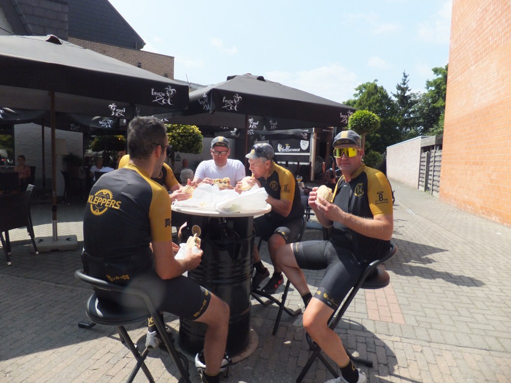 Met een gevulde maag ging de rit verder. Uiteindelijk kwamen we aan bij ons doel: ‘De noordelijkste grenspaal van België’. Allen samen op de foto en weer verder. Langs de mooie wegen van Hoogstraten en Turnhout fietsten we terug richting het mooie Limburg. Sommige hadden hun zinnen gezet op de hamburger die ons was beloofd aan het einde van de rit, met als gevolg dat ‘El capo’ alle registers opentrok. Met een rotvaart van 40km/u ging het richting ons clublokaal Het Achtste Sacrament. Maar enkele km’s later maakte de voorzitter de kopmannen erop attent dat het vanachter in de groep richting de 50km/u ging, in combinatie met lege drinkbussen en hijgende Kleppers. Er werd een onvoorziene last minute pitstop ingelast te Dessel voor onze suikerspiegel aan te vullen. Alle kleppers hadden een genoegen met een frisse ice-tea, behalve K. Kums aka K. Koms wou een ice-tea green. Met nog 30km op de teller ging het langs onze bekende wegen richting het terras van Het Achtste Sacrament. Op de Schansstraat werden de laatste krachten volledig opgebruikt. Het treintje werd opgezet door Pinda, die vervolgens tal van kleppers afzette om de brug op te sprinten. Hier kwam onze beresterke K.D. als eerste boven, die aan een buitengewoon goed seizoen bezig is!Aangekomen bij Het Achtste Sacrament kwam de geur van de hamburgers ons al tegemoet. Heerlijk na zo een rit! Bedankt aan iedereen die erbij was om er een topdag van te maken!