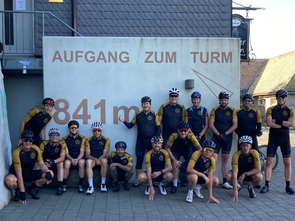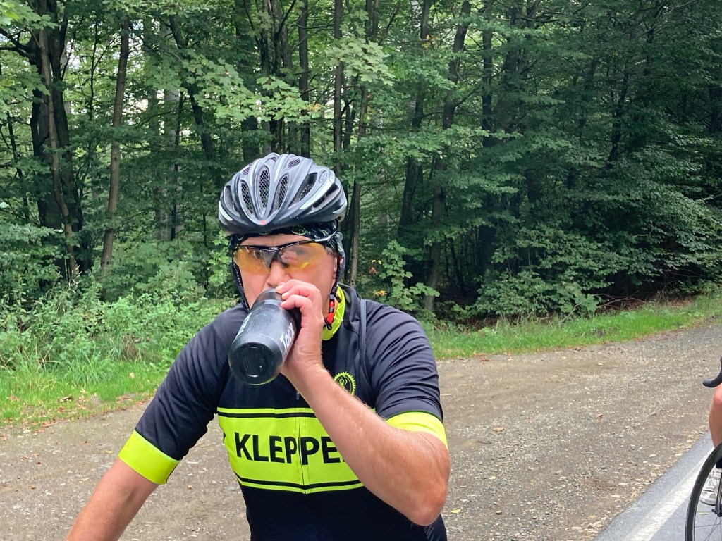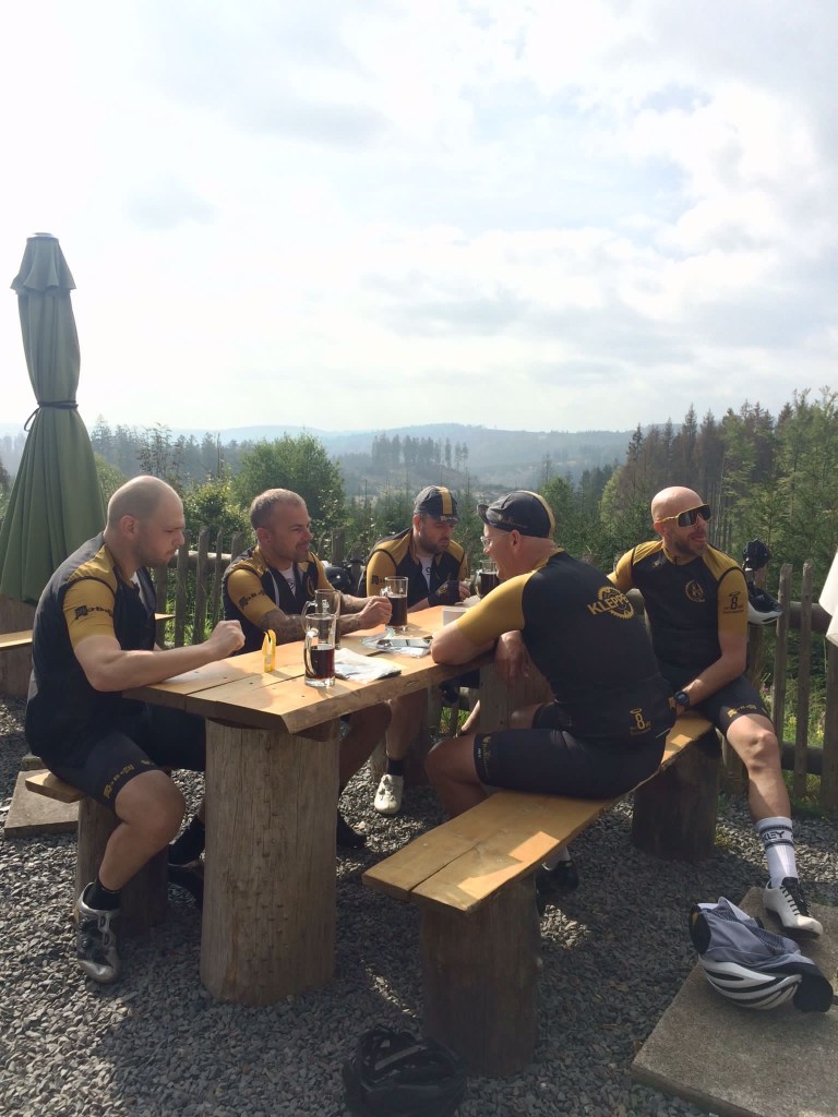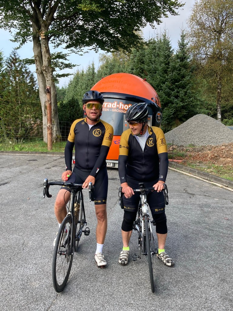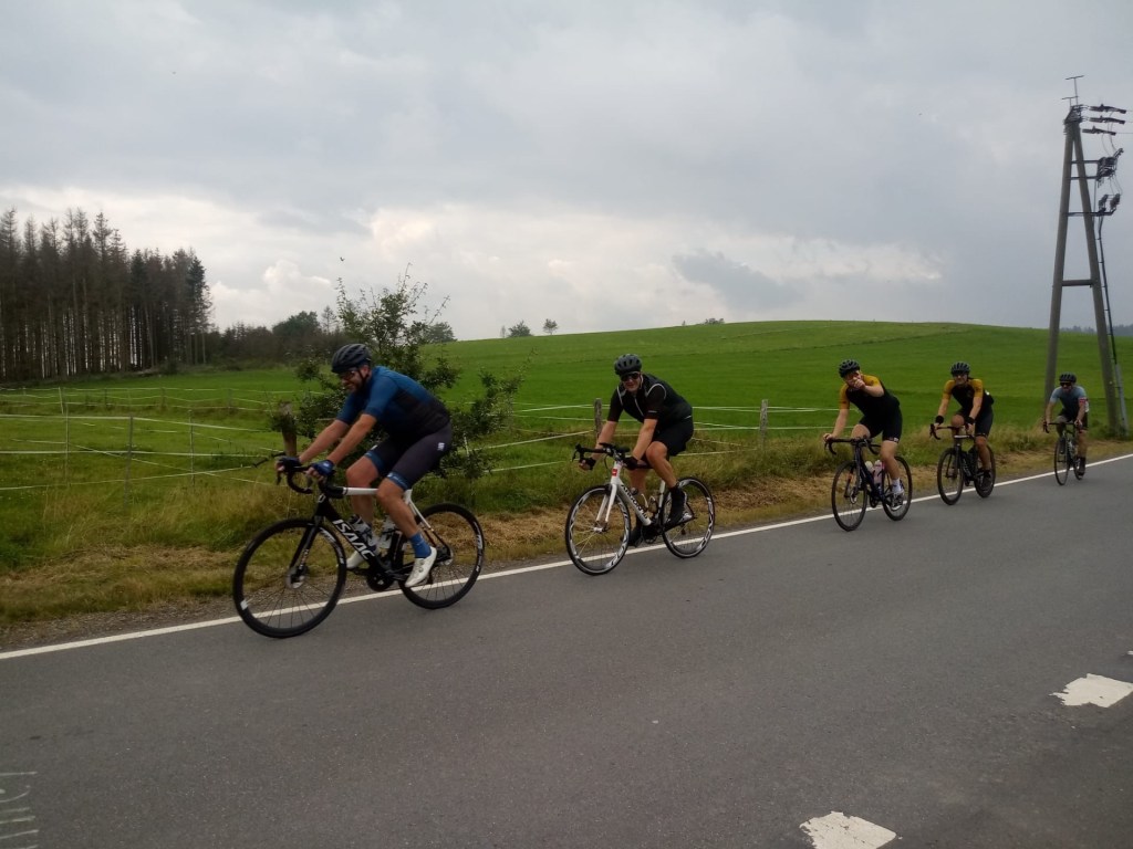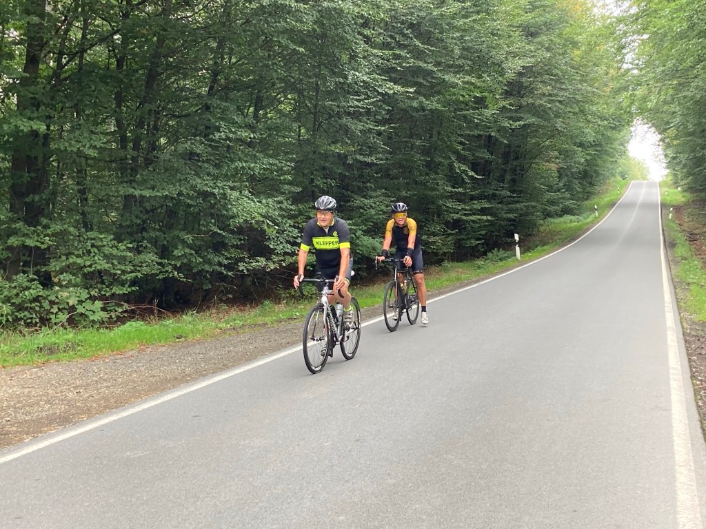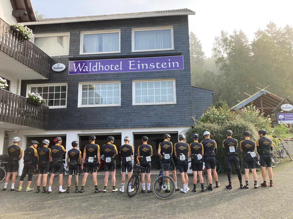Donderdag landden de routes op de whatsapp en werden ze geanaliseerd door velen onder ons. ’ Het wordt pittig.’ Vrijdagmorgen, iedereen op tijd aan het 8ste, nog snel een koffietje en weg waren we. Onderweg even de benen strekken op een parking en omstreeks 11.00 uur maken we vanuit de auto kennis met de een van de drie beklimmingen naar en rond het hotel. De prestaties hierop van enkele van onze snelle jongens zullen nog lang op Strava te zien zijn. De hartelijk ontvangst door de gastheer en gastvrouw van het Waldhotel Einstein gaf ons allemaal een goed gevoel. Eerst de kamerverdeling, de koffers en de fietsen uitladen en dan belegde broodjes. Het eerste setje koerskledij wordt uitgehaald en omstreeks 12.30 gaan we van start voor de eerste rit van 90 kilometer. Na een lange aanloop krijgen we een hele reeks beklimmingen en afdalingen voor de wielen die ons leiden tot het hoogste punt van de route op 680 meter. Bij één van de afdalingen hadden twee van onze makkers een goede engelbewaarder en konden hun route zonder veel erg verder zetten. Uiteindelijk kregen we nog een prachtige afdaling met verschillende haarspeldbochten om tot slot vanuit Marmecke nog een klimmetje tot aan de achterzijde van het hotel te overwinnen. Missie geslaagd voor de eerste dag die bij aankomst eindigde met een gezellig samenzijn buiten op het terras alvorens het avondeten werd geserveerd omstreeks 19.00 uur. De routeplanner (lees de uitbater) maakte voor de eerste keer kennis met de definitie van een Klepper, zeker als hij de gemiddeldes van die dag onder de neus kreeg geschoven. De goulash met kroketten en warme groenten ging er vlot in en werd verder weggespoeld met menige halve liter van verschillende soort. In de loop van de avond kwamen de straffe verhalen naar boven en werd er letterlijk en figuurlijk sportief nagekaart en werd de route van daags nadien lichtjes aangepast door toevoeging van een extra lus van 30 km voor de Klepper-Kleppers. De gastvrouw had haar handen vol aan de bar en ook daar sneuvelden er enkele KOMmen. Zaterdag morgen, de koninginnenrit naar het hoogste punt van Sauerland via tal van kleine dorpjes, prachtige klimmen en mooie afdalingen waarvan sommige gevaarlijk omwille van de slechte staat van de weg. Een uitgebreid en stevig ontbijt moest ons wapenen voor het eerste deel van de rit. Liters fruitsap werden de vervanger van het gerstensap van de avond voordien. Het merendeel van de fietsers diende zicht te melden bij de koersdirecteur om zijn rugnummer in ontvangst te nemen. De light-versie van de route werd definitief van de kaart geveegd. Iedereen ging voor de 152 Km en sommigen nog voor de extra lus. Samenkomst was voorzien in Hallenberg waar we op 85 km op zoek moesten naar eten. Na veel geduld een pizza of een pasta, die bij sommigen nog wel even op de maag bleef liggen, werd de weg verder gezet richting de Kahler Asten het hoogste punt in de omgeving Winterberg. Vanaf dan was het volgens de analyse van sommigen alleen nog maar dalen tot het hotel, doch het gevoel op de fiets was net iets anders. Uiteindelijk kwamen we, met wel een behoorlijk tijdsverschil , na 18.00 uur aan met tot slot nog twee knoesten van beklimmingen waaronder die ene waar we kennis mee maakten de eerste dag met de auto. Dankzij Wout staat deze op STRAVA, onherroepelijk verbonden met de Kleppers de eerste jaren. Na een driegangenmenu met pasta, waarin we nog een vleugje goulash herkenden van daags voordien, maar daarom niet minder lekker, werden er nog zware analyses gemaakt. Wijn en Krombacher maakten deze alleen maar gedetailleerder tot de laatsten omstreeks 02.30 uur onder de wol kropen om zich mentaal voor te bereiden op de slotetappe. Zondagmorgen, na een stevig ontbijt werden ons onmiddellijk een paar stevige kuitenbijters voorgeschoteld, die bij velen onder ons pijn deden in de benen. Halverwege, na een korte pauze aan het stuwmeer werd de route verder gezet met nog een paar mooie klimmen en afdalingen. In de achterhoede werd Tom even verrast op een pittige klim richting Jackelchen waar de meeste GPS-toestellen een stijging van 22 procent aantikten. “Het was maar ne korte hé Tom”. Via enkele van de mooie maar eerder zeldzame fietspaden werd de weg verder gezet richting Kirchhundem . Van daaruit verder naar de laatste pittige klim tot het hotel. Terwijl de laatsten langs die weg arriveerden deed Joris, aan de achterzijde van het hotel, nog een succesvolle poging op de KOM van de Einsteinpickel , waardoor die ook voor de eerste periode geboekt staat op Strava. Sterk mannenNog even douchen, koffers pakken, een goed vullend lokaal aardappelgerecht verorberen om vervolgens afscheid te nemen van onze gastheer en gastvrouw en huiswaarts te keren. Moest de heer Einstein nog geleefd hebben had hij ook een formule uitgevonden voor het woord Kleppers. Gelukkig kunnen wij hieraan zelf een invulling geven. Termen als Sportief, Pittig, Gezellig en Kameraadschap zouden in deze formule zeker niet mogen ontbreken.Toch willen we ook even stilstaan bij Anton en Kristof, de twee die niet meekonden, maar die zeker hun sportieve en kameraadschappelijke bijdrage zouden geleverd hebben aan dit weekend. Anton bedankt voor de organisatie en Kristof sterkte de komende tijd. Een pittig maar geslaagd weekend!