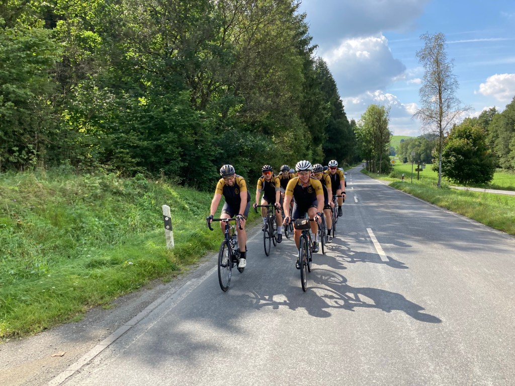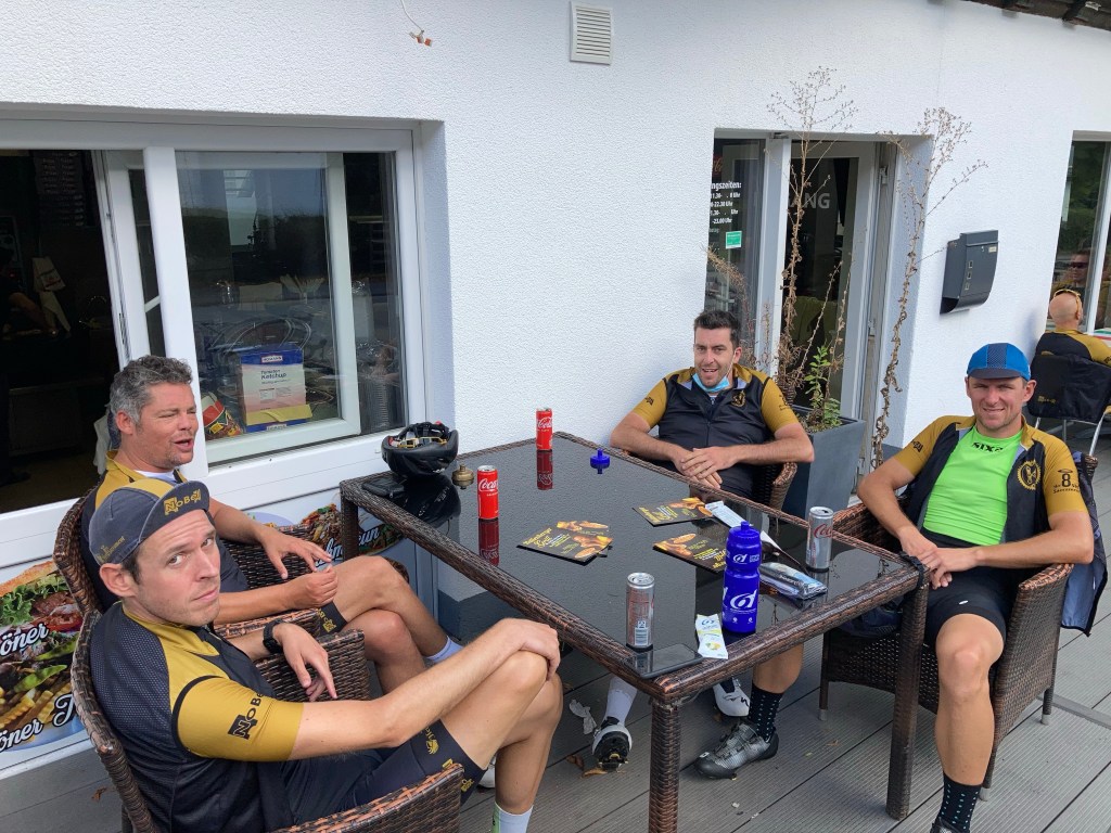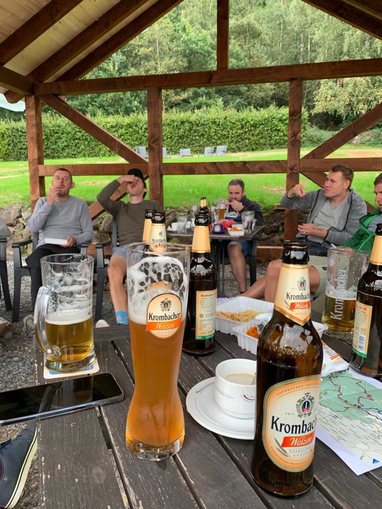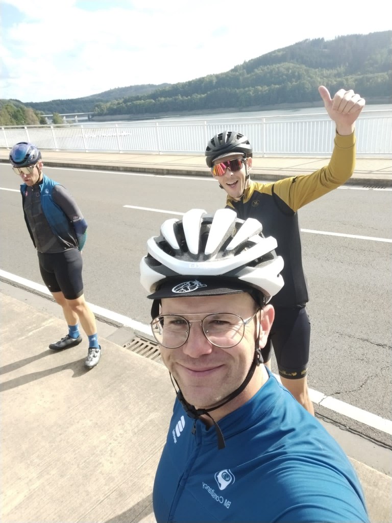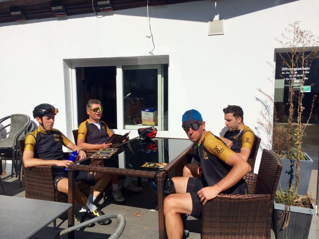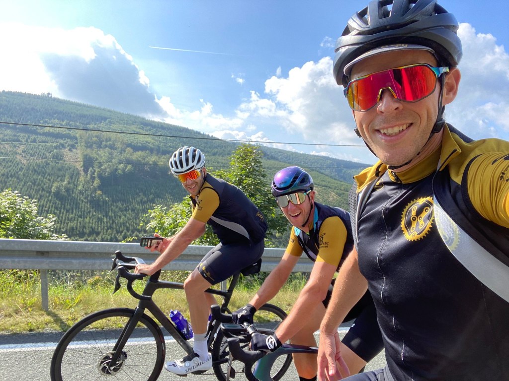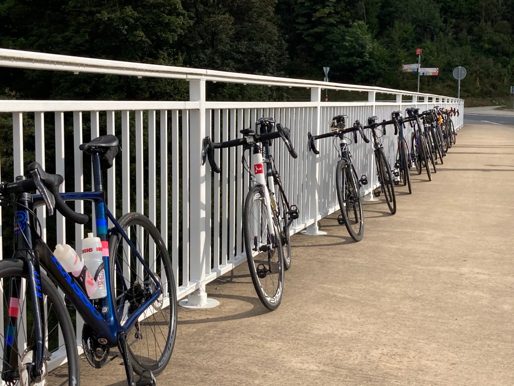 Donderdag landden de routes op de whatsapp en werden ze geanaliseerd door velen onder ons. ’ Het wordt pittig.’ Vrijdagmorgen, iedereen op tijd aan het 8ste, nog snel een koffietje en weg waren we. Onderweg even de benen strekken op een parking en omstreeks 11.00 uur maken we vanuit de auto kennis met de een van de drie beklimmingen naar en rond het hotel. De prestaties hierop van enkele van onze snelle jongens zullen nog lang op Strava te zien zijn. De hartelijk ontvangst door de gastheer en gastvrouw van het Waldhotel Einstein gaf ons allemaal een goed gevoel. Eerst de kamerverdeling, de koffers en de fietsen uitladen en dan belegde broodjes. Het eerste setje koerskledij wordt uitgehaald en omstreeks 12.30 gaan we van start voor de eerste rit van 90 kilometer. Na een lange aanloop krijgen we een hele reeks beklimmingen en afdalingen voor de wielen die ons leiden tot het hoogste punt van de route op 680 meter. Bij één van de afdalingen hadden twee van onze makkers een goede engelbewaarder en konden hun route zonder veel erg verder zetten. Uiteindelijk kregen we nog een prachtige afdaling met verschillende haarspeldbochten om tot slot vanuit Marmecke nog een klimmetje tot aan de achterzijde van het hotel te overwinnen. Missie geslaagd voor de eerste dag die bij aankomst eindigde met een gezellig samenzijn buiten op het terras alvorens het avondeten werd geserveerd omstreeks 19.00 uur. De routeplanner (lees de uitbater) maakte voor de eerste keer kennis met de definitie van een Klepper, zeker als hij de gemiddeldes van die dag onder de neus kreeg geschoven. De goulash met kroketten en warme groenten ging er vlot in en werd verder weggespoeld met menige halve liter van verschillende soort. In de loop van de avond kwamen de straffe verhalen naar boven en werd er letterlijk en figuurlijk sportief nagekaart en werd de route van daags nadien lichtjes aangepast door toevoeging van een extra lus van 30 km voor de Klepper-Kleppers. De gastvrouw had haar handen vol aan de bar en ook daar sneuvelden er enkele KOMmen. Zaterdag morgen, de koninginnenrit naar het hoogste punt van Sauerland via tal van kleine dorpjes, prachtige klimmen en mooie afdalingen waarvan sommige gevaarlijk omwille van de slechte staat van de weg. Een uitgebreid en stevig ontbijt moest ons wapenen voor het eerste deel van de rit. Liters fruitsap werden de vervanger van het gerstensap van de avond voordien. Het merendeel van de fietsers diende zicht te melden bij de koersdirecteur om zijn rugnummer in ontvangst te nemen. De light-versie van de route werd definitief van de kaart geveegd. Iedereen ging voor de 152 Km en sommigen nog voor de extra lus. Samenkomst was voorzien in Hallenberg waar we op 85 km op zoek moesten naar eten. Na veel geduld een pizza of een pasta, die bij sommigen nog wel even op de maag bleef liggen, werd de weg verder gezet richting de Kahler Asten het hoogste punt in de omgeving Winterberg. Vanaf dan was het volgens de analyse van sommigen alleen nog maar dalen tot het hotel, doch het gevoel op de fiets was net iets anders. Uiteindelijk kwamen we, met wel een behoorlijk tijdsverschil , na 18.00 uur aan met tot slot nog twee knoesten van beklimmingen waaronder die ene waar we kennis mee maakten de eerste dag met de auto. Dankzij Wout staat deze op STRAVA, onherroepelijk verbonden met de Kleppers de eerste jaren. Na een driegangenmenu met pasta, waarin we nog een vleugje goulash herkenden van daags voordien, maar daarom niet minder lekker, werden er nog zware analyses gemaakt. Wijn en Krombacher maakten deze alleen maar gedetailleerder tot de laatsten omstreeks 02.30 uur onder de wol kropen om zich mentaal voor te bereiden op de slotetappe. Zondagmorgen, na een stevig ontbijt werden ons onmiddellijk een paar stevige kuitenbijters voorgeschoteld, die bij velen onder ons pijn deden in de benen. Halverwege, na een korte pauze aan het stuwmeer werd de route verder gezet met nog een paar mooie klimmen en afdalingen. In de achterhoede werd Tom even verrast op een pittige klim richting Jackelchen waar de meeste GPS-toestellen een stijging van 22 procent aantikten. “Het was maar ne korte hé Tom”. Via enkele van de mooie maar eerder zeldzame fietspaden werd de weg verder gezet richting Kirchhundem . Van daaruit verder naar de laatste pittige klim tot het hotel. Terwijl de laatsten langs die weg arriveerden deed Joris, aan de achterzijde van het hotel, nog een succesvolle poging op de KOM van de Einsteinpickel , waardoor die ook voor de eerste periode geboekt staat op Strava. Sterk mannenNog even douchen, koffers pakken, een goed vullend lokaal aardappelgerecht verorberen om vervolgens afscheid te nemen van onze gastheer en gastvrouw en huiswaarts te keren. Moest de heer Einstein nog geleefd hebben had hij ook een formule uitgevonden voor het woord Kleppers. Gelukkig kunnen wij hieraan zelf een invulling geven. Termen als Sportief, Pittig, Gezellig en Kameraadschap zouden in deze formule zeker niet mogen ontbreken.Toch willen we ook even stilstaan bij Anton en Kristof, de twee die niet meekonden, maar die zeker hun sportieve en kameraadschappelijke bijdrage zouden geleverd hebben aan dit weekend. Anton bedankt voor de organisatie en Kristof sterkte de komende tijd. Een pittig maar geslaagd weekend!