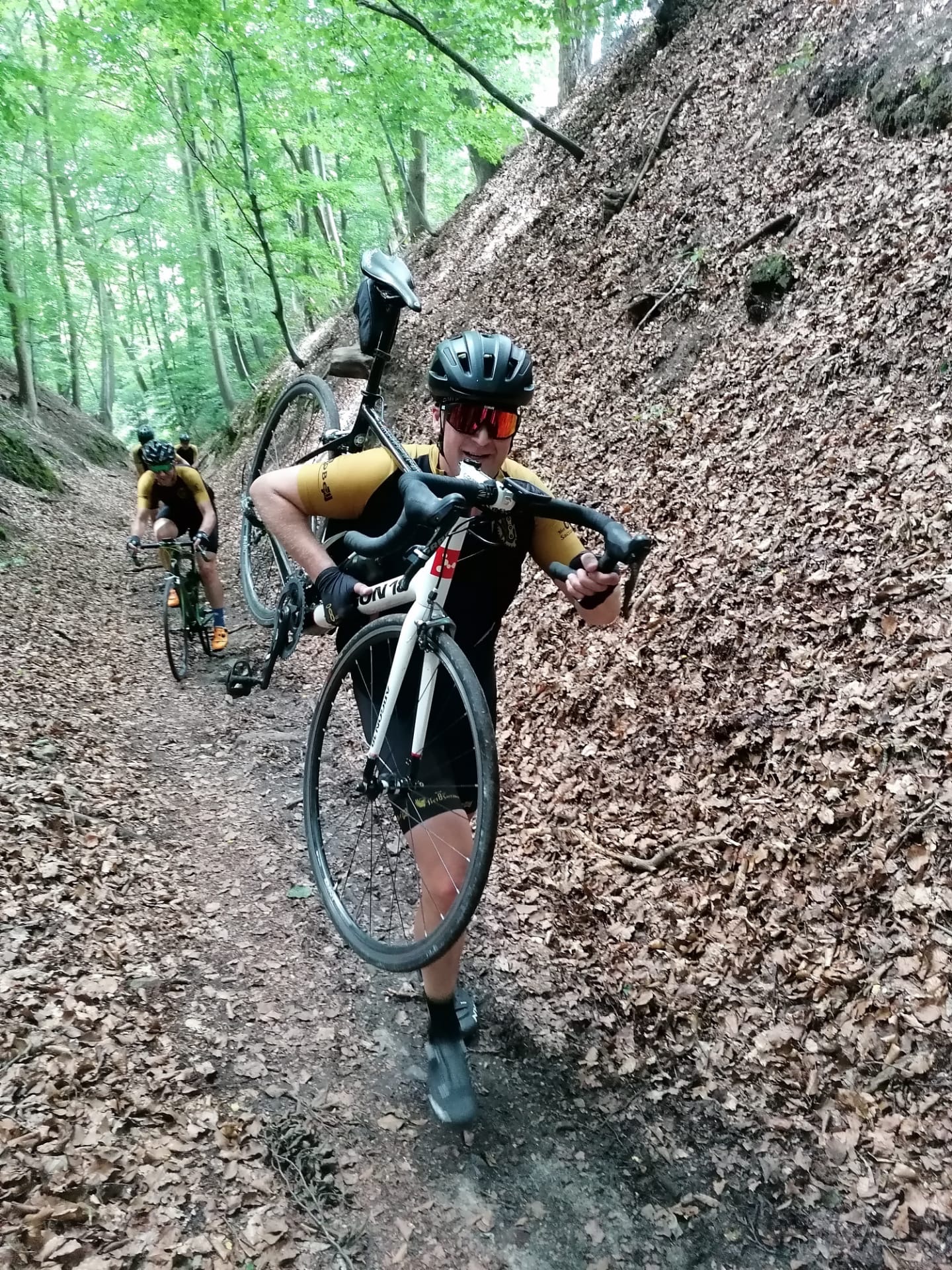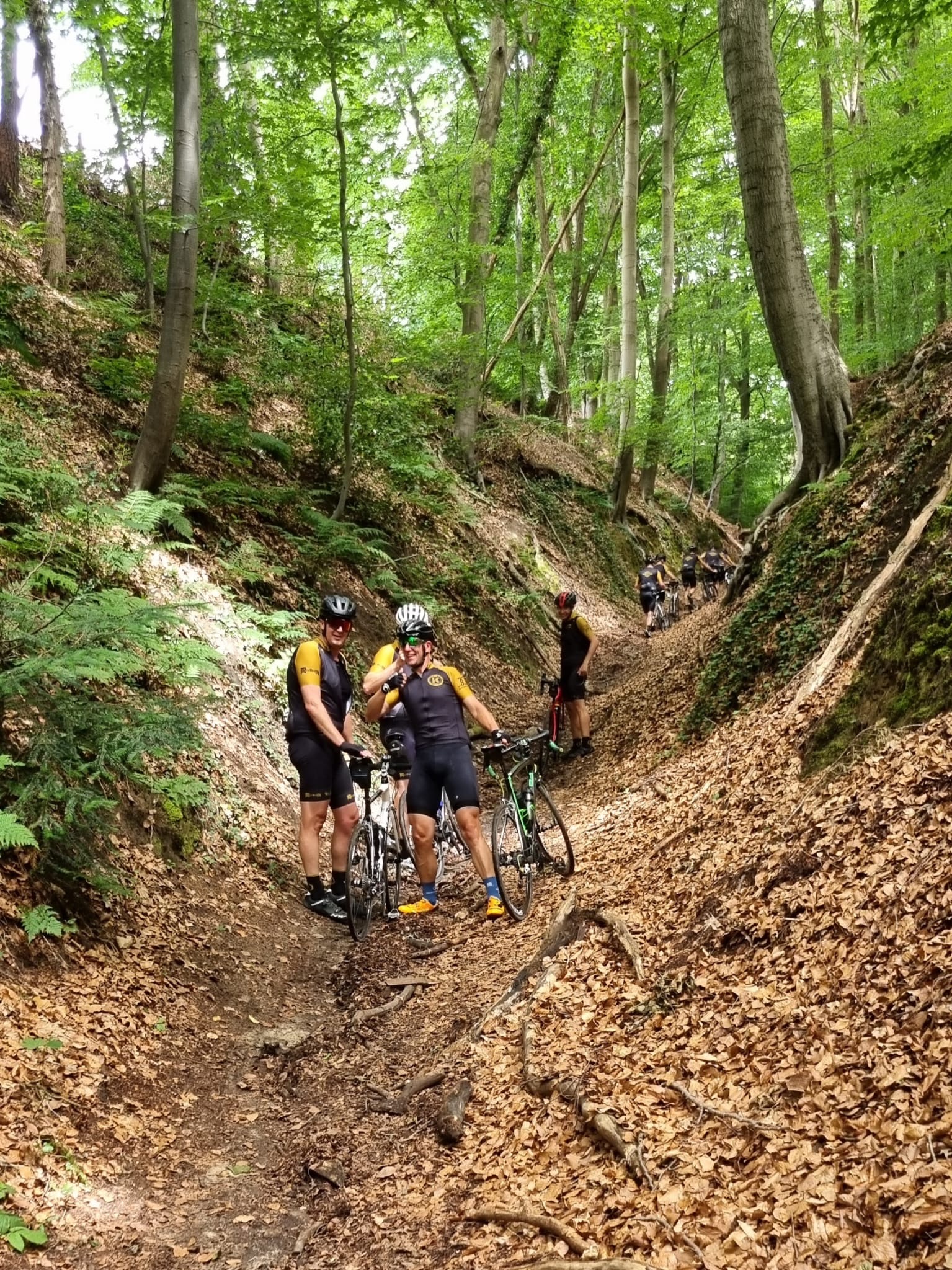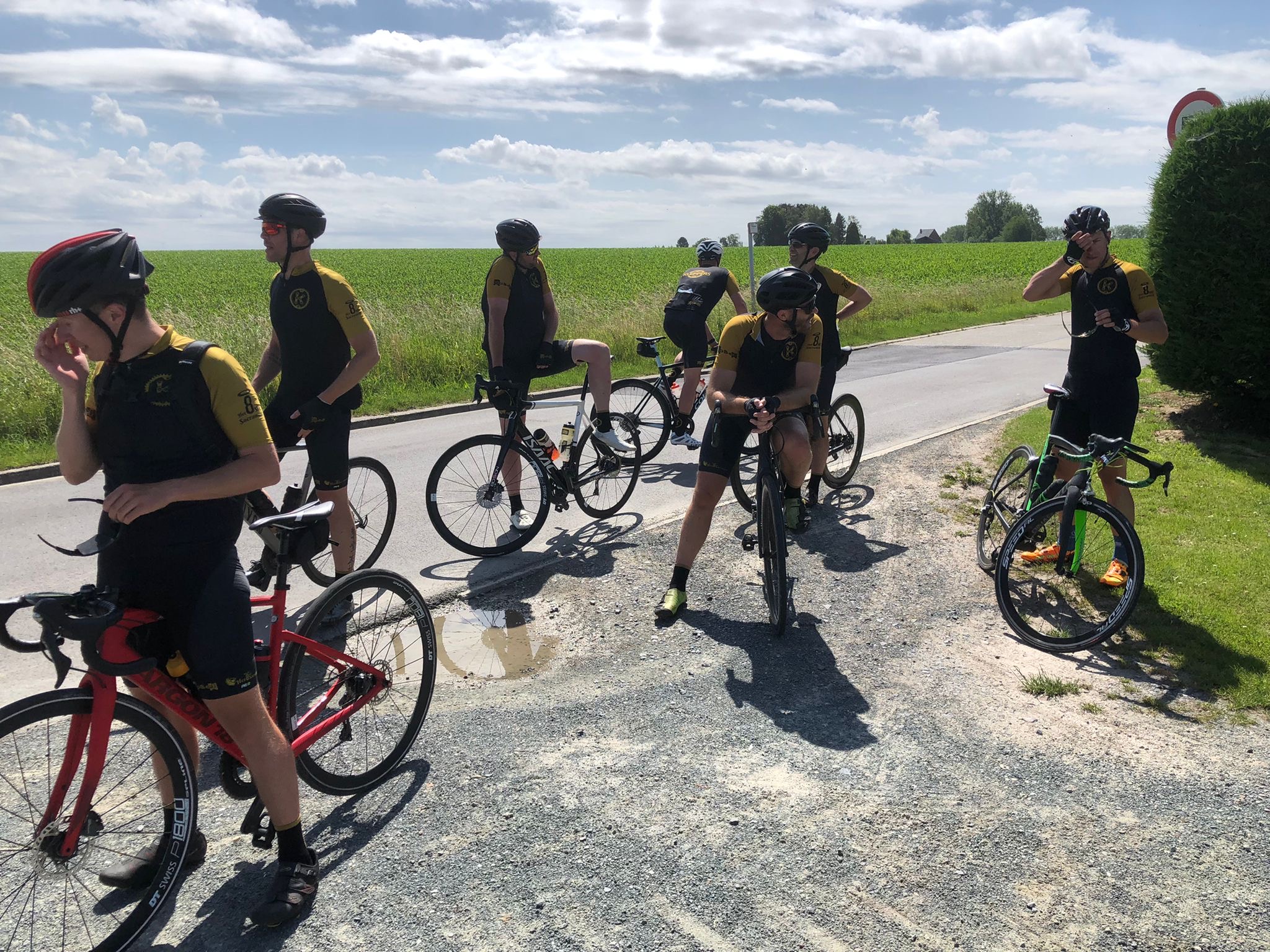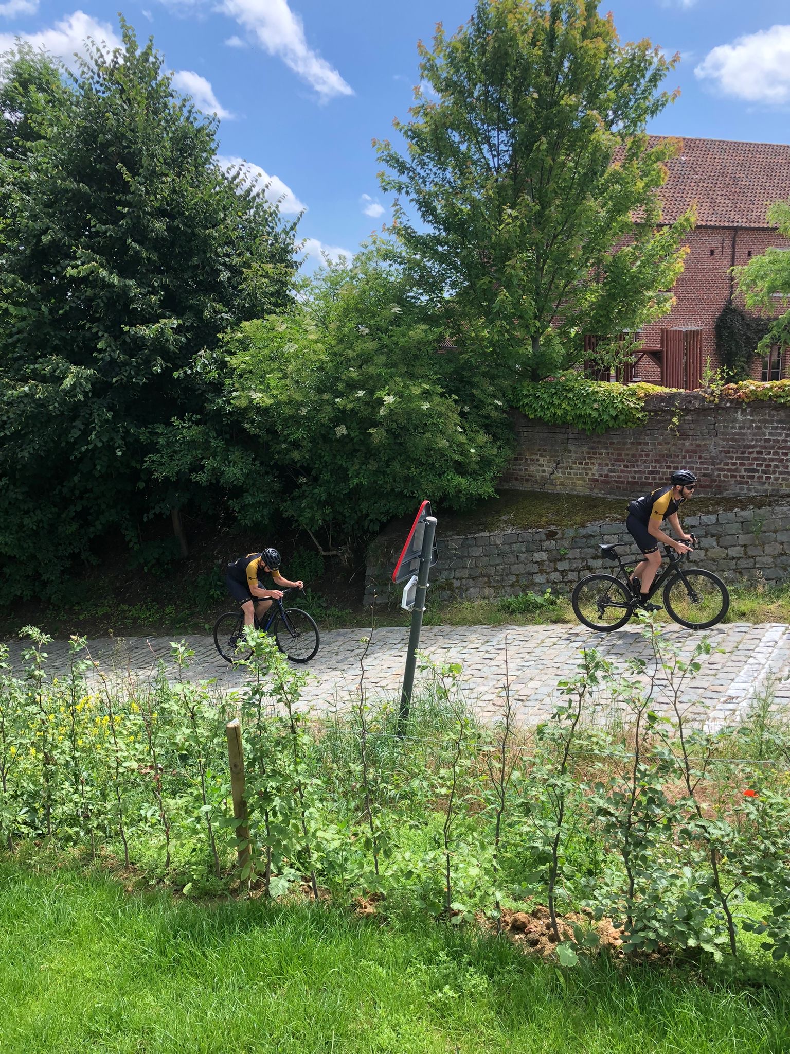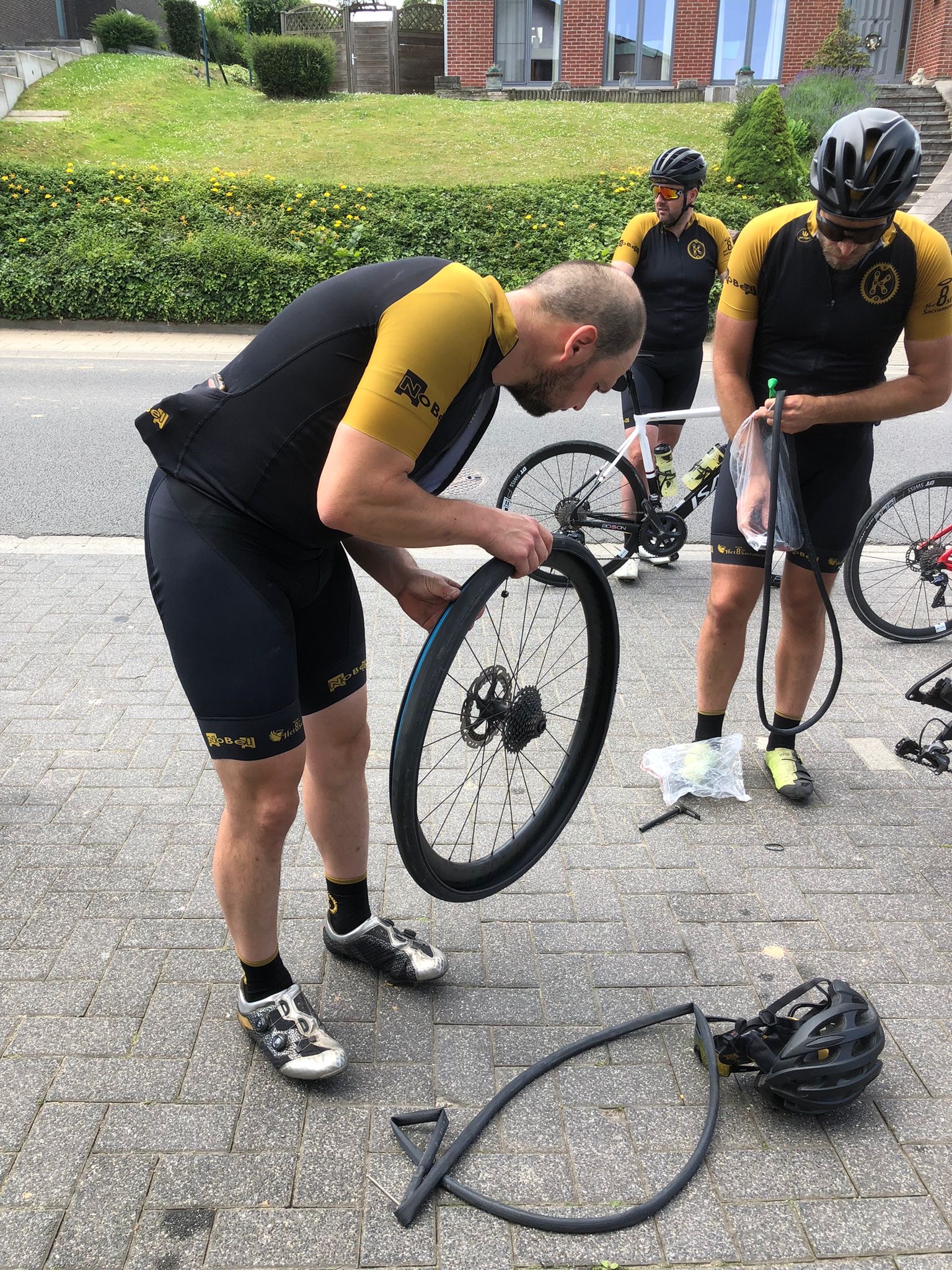 De tocht werd verder gezet richting Pelt en zoals we geëindigd waren voor de lunch, zijn we hier ook weer vertrokken: Bergop!. Na menigte kassei stroken, enkele gravel stroken en mooie race tarmac draaide we hier een klim op waar Jezus himself nog niet wat geweest. Halverwege waren we genoodzaakt om te voet tot boven te gaan. Ook hier zijn we zonder kleerscheuren uit gekomen. Helaas stonden we enkele honderden meters verder wel stil voor een lekke band. Op zo’n moment begint er dan bij 1 klepper de vingers te jeuken en het zweet te vloeien. Hij kan zich dan, gelukkig voor ons, niet bedwingen en hersteld de band in een tijd waar ze bij de F1 jaloers op zijn.