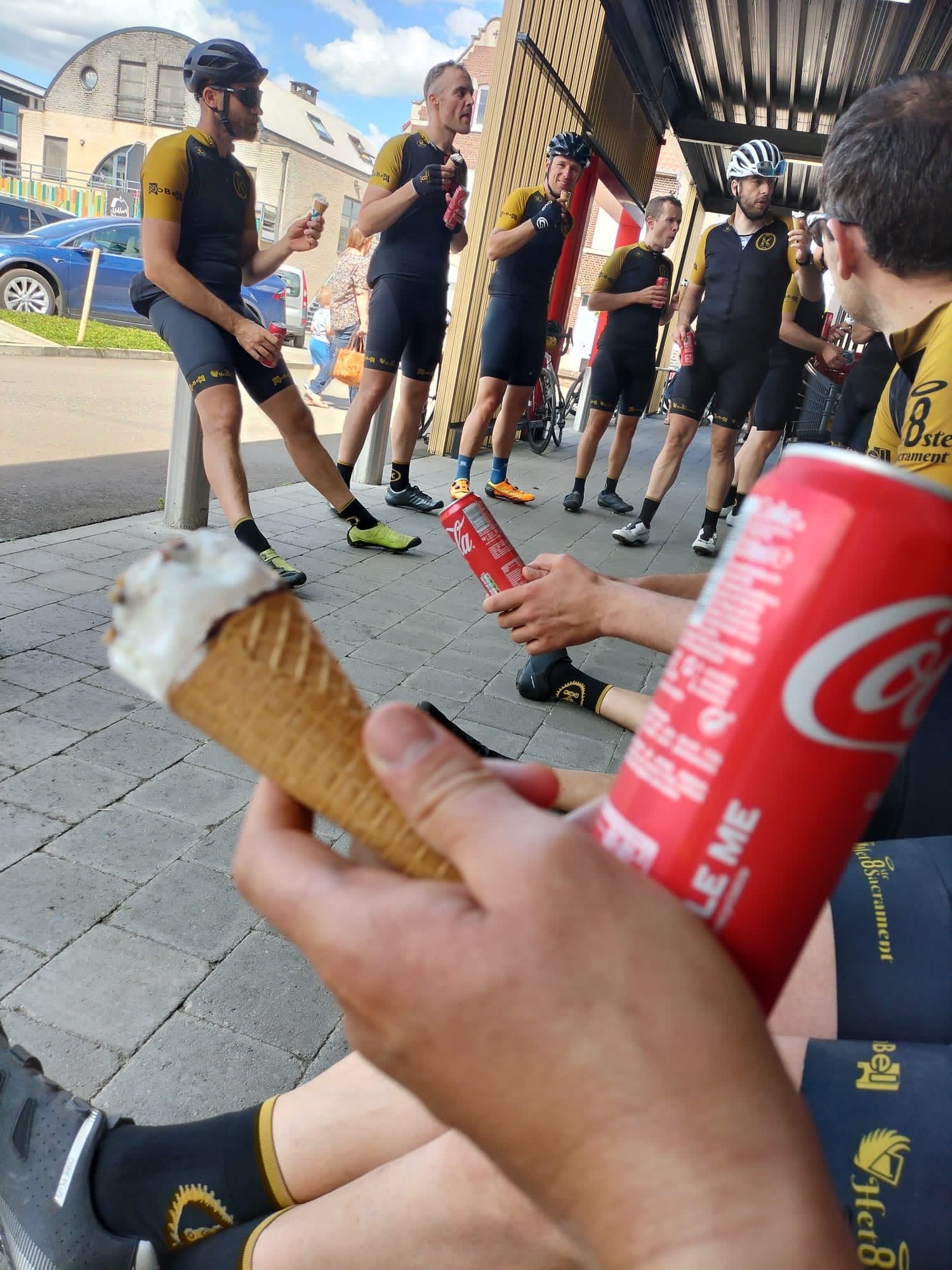 Op 60km van het einde hadden de meeste nood aan wat extra suikers en is er een kleine hold-up gepleegd in de lokale Spar van Glabbeek. Water, cola, ijs en 1L chocomel zijn hier uit de rekken verdwenen. De cola ging hier rijkelijk binnen, de ijsjes werden zonder kauwen doorgeslikt en de chocomelk werd ad fundum leeggedronken. Een stel hongerige leeuwen waren er niets tegen.