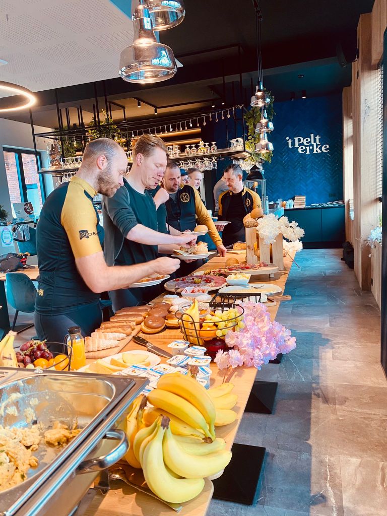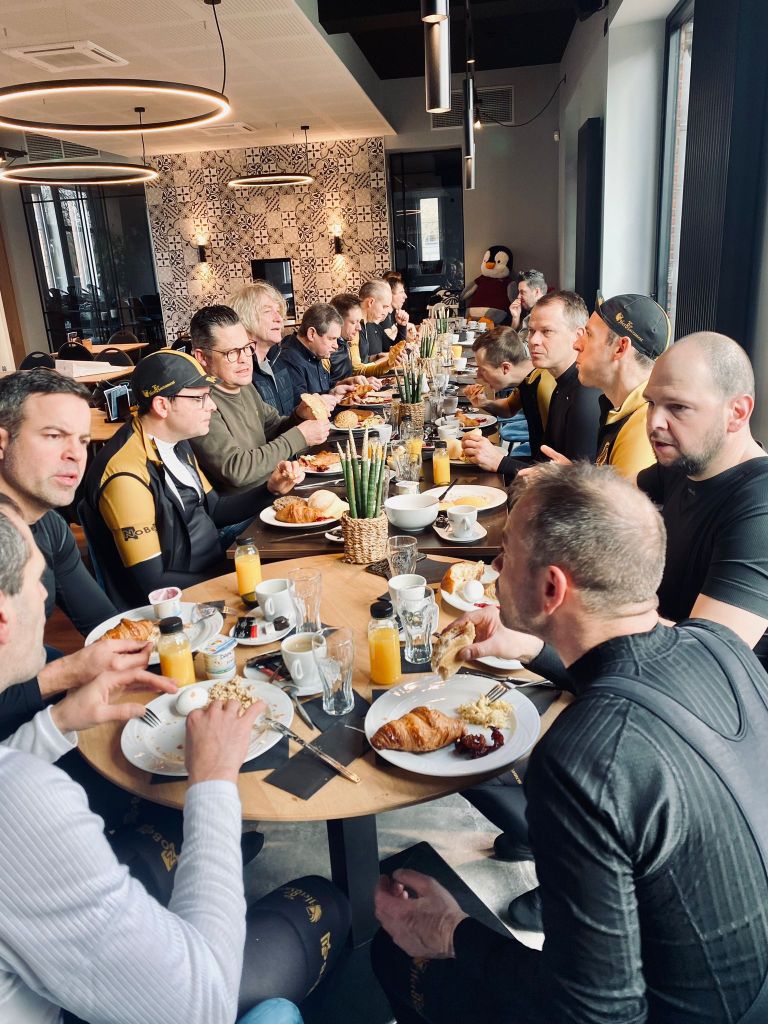 Zaterdag 25 maart stond al geruime tijd rood omcirkeld in de agenda van menig Klepper. Op het programma: ontbijten in Cafetaria ’t Pelterke en dan de openingsrit van seizoen 2023. Het aantal hits op de buienradar zal de voorbije dagen een piek bereikt hebben maar windkracht 5, buien, kans op onweer… niets zou De Kleppers kunnen tegenhouden om eindelijk aan het fietsseizoen te kunnen beginnen. En het begon al meteen goed. Een lekker en gevarieerd ontbijt, aangeboden door het bestuur en netjes verzorgd door Evy en T kruimeltje zorgde voor de nodige brandstof voor onderweg. Sommigen zouden zich wel de 3de puddingkoek beklagen maar ach, zo zonder vrouw en kinderen konden we ons wel eens laten gaan en waanden we ons aan het buffet van een all-in resort. De vestimentaire keuzes werden nog eens vergeleken en na de groepsfoto vertrokken we voor een rit van 75km oostwaarts. Jawel: met een flinke zuid-wester zou het venijn pas na halfweg toeslaan. In gestrekte draf ging het via Lille en Bocholt naar Molenbeersel. Op de korte stroken zuidwaarts merkten we al hoe de wind ons op de proef zou stellen. En op ’t Hasselt wisten we hoe laat het was: wissel om de 5km werd aangepast naar 3km tot zelfs 500m. Wie in de buik van het peloton verscholen zat dacht dat Pinda vooraan aan het surplacen was. Tot er overgenomen moest worden. Toen werd duidelijk dat de Kleppers de strijd met de natuurelementen aangegaan waren en kwam de Flandrien in elk van ons naar boven. Regenjasjes werden bovengehaald, gellekes en bananen zorgen voor extra energie om deel 2 van de rit aan te vatten. Was het trouwens toeval dat er al enkele Kleppers rondreden met een mooi en zeer bestendig regenjasje van de kledingsponsor van volgend jaar? Goede keuze in ieder geval want na de kuitenbijters van Klein Zwitserland in Opitter en omstreken gingen de hemelsluizen open. Hier werd ook duidelijk dat sommige Kleppers pas uit hun winterslaap kwamen en anderen er al een klassieker of hoogtestage op hadden zitten. Kameraadschap zorgde ervoor dat iedereen zijn strijd tegen de natuur aankon en toen we in Peer de wind in de rug kregen was het flyeren naar Pelt. Al was het vat voor de meesten zo goed als af. Afgesloten werd er zoals vanouds in Het 8ste Sacrament waar de vaste stamgasten toch even vreemd opkeken toen er een bende verzopen (nee niet bezopen) Kleppers binnen kwamen gewaaid. De choco en koffie deden deugd, de rit werd geanalyseerd (geen enkele platte band!), plannen werden besproken. Eén zaak was duidelijk: de organisatie was zoals steeds weer top en de Kleppers zijn klaar voor een top-seizoen!