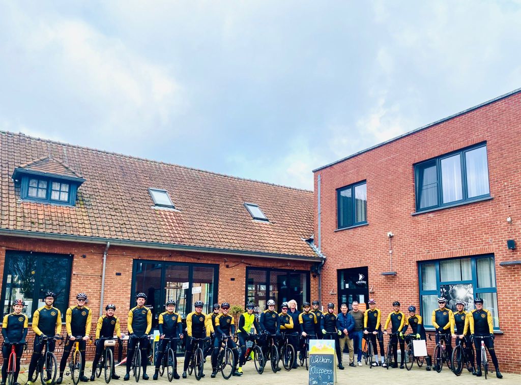 Een kleine 30 Kleppers verzamelden zich om 9u bij het clublokaal annex stamkroeg Het 8ste Sacrament. De laatste zaterdag van maart was reeds enkele maanden met rood omcirkeld in diverse agenda’s. Deze dag konden alle Kleppers hun nieuwe tenue showen, een groen witte uitrusting met het logo van FFP, Flanders Food Productions onze nieuwe partner voor de komende 4 jaar, prominent aanwezig.